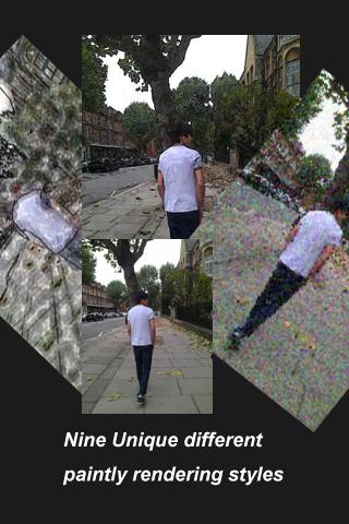 El usuario puede cargar la imagen desde la galería o tomar una foto en la página principal. Para el primer uso, no habrá un tutorial completo con botones que se encienden y gestos animados para guiar al usuario. El usuario puede iniciar el pintor de la galería de fotos usando el botón de acción directa. Las imágenes se pueden guardar en la tarjeta SD o compartir en Facebook fácilmente en el menú de opciones.
